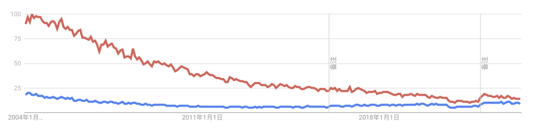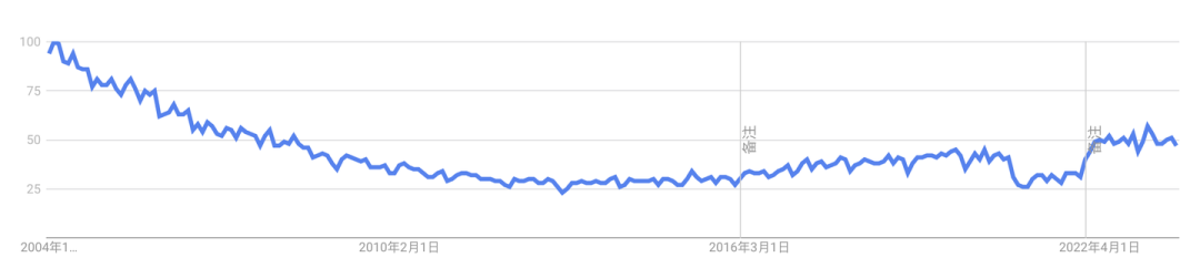在百度指数上,也能观察到类似的起伏,此外,相比 Google 中国地区热搜趋势,还有额外5年的滞后性。