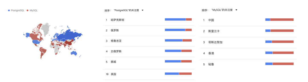 在美国的数据中,PostgreSQL:MySQL = 69:61,PG 热度约是 MySQL 的 1.13 倍,在俄罗斯的数据中则更为离谱,PostgreSQL:MySQL 达到了 70:22 ,也就是 3.18 倍!而中国的数据相反:过去30天,MySQL 热度是 PostgreSQL 的 4.8 倍。