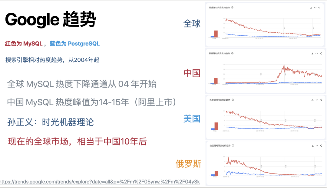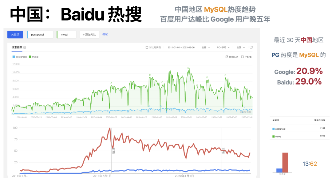 作者接着根据“搜索引擎数据”提出:全球 MySQL 流行度是 PostgreSQL 的 3 倍,在中国 MySQL 流行度是 PG 的 6 ~ 7 倍。我们上面已经说过了,搜索引擎热搜的数据无法推翻具有更强效力的问卷调研,但这不妨碍我们来看一看这些搜索引擎数据又能为我们带来什么新的洞察?