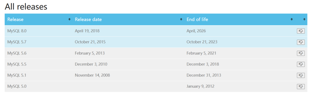 从微软的网站可以看到MySQL不同版本的生命周期。MySQL 5.7于2015年10月21日发布,EOL时间为2023年10月21日。