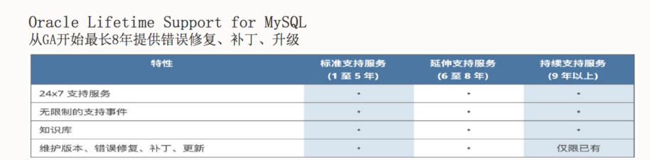 被Oracle收购后,MySQL一直遵循着其开发规则,用户能在其产品版本立项阶段就清楚其产品周期。在标准支持服务阶段,社区版用户能够定期进行版本维护,包括错误修复、补丁更新等;在延伸支持服务与持续支持服务阶段,产品只能提供有限的乃至停止服务;当超过9年后,不会进行任何的代码更改与持续支持服务。