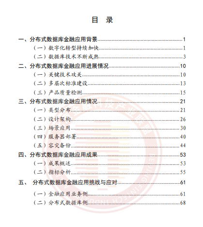 本报告从分布式数据库在金融领域应用背景出发,结合联盟在分布式数据库领域的工作成果,通过行业调研、应用数据统计、应用效果分析,勾勒出分布式数据库技术在金融行业的发展面貌,并整理了分布式数据库技术应用的痛点难点,提出了应对建议,为从业者深入了解分布式数据库金融领域发展情况提供有益的启发。