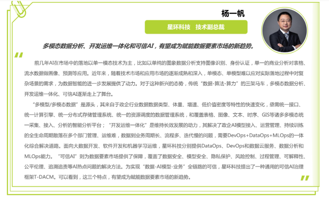 星环科技作为人工智能领域代表性企业,入选《2022年中国人工智能产业研究报告》产业图谱机器学习、数据治理板块。同时星环科技技术副总裁杨一帆受邀对人工智能产业发展趋势发表观点,他表示多模态数据分析、开发运维一体化和可信AI,有望成为赋能数据要素市场的新趋势。