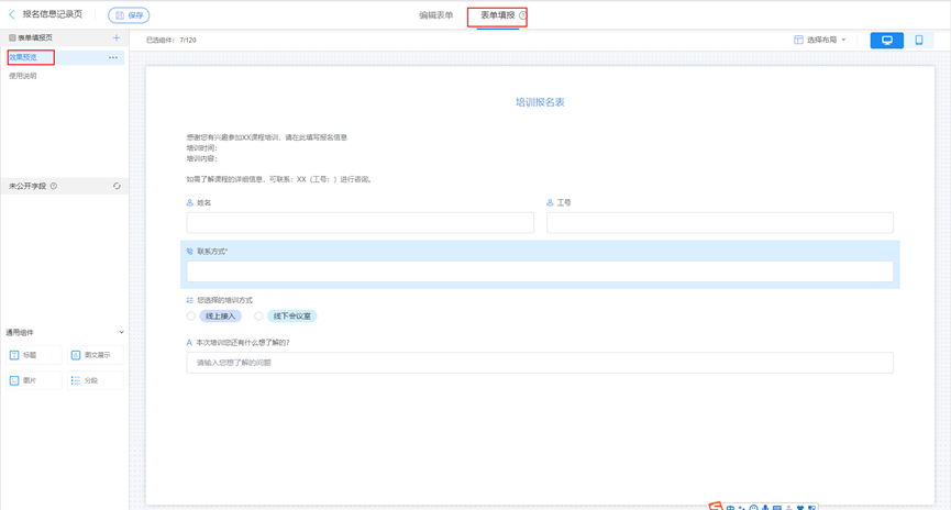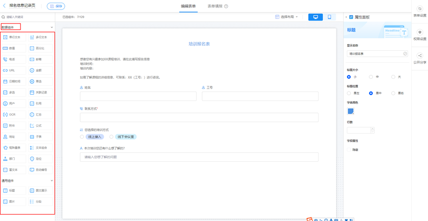 进入编辑界面即可对表单进行编辑,左边为数据组件栏,可以选择需要用到的组件进行添加