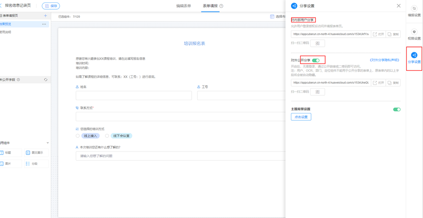 分享设置,可以进行内部分享及外部分享,注意外部分享需在保存表单后,生成的链接和二维码才能生效。