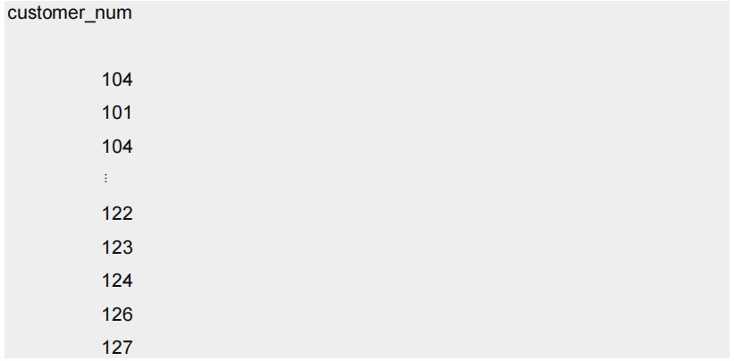 该结果显示了语句如何只选择 orders 表中 customer_num 列中的所有数据,并列出所有订单