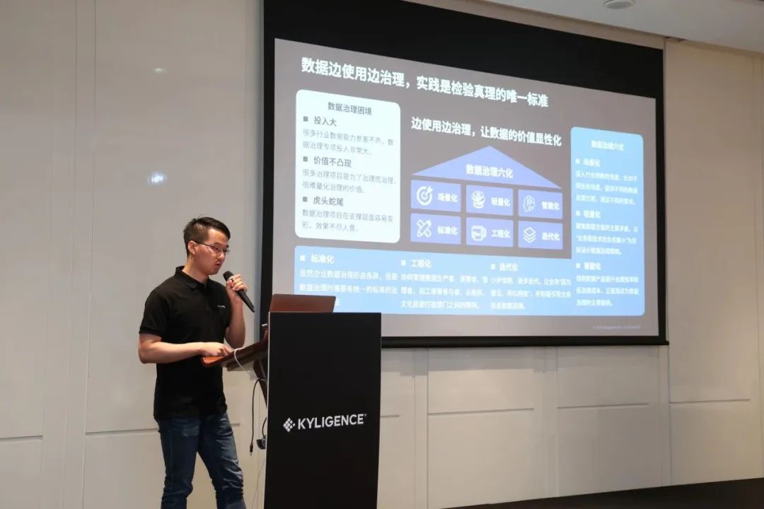 Kyligence 解决方案总监刘存具体介绍了银行实践案例。他指出,目前许多银行正在从被动响应往主动服务迈进,借助智能化和自动化技术,力求减少人工干预的程度,运用科学决策减少对专家经验的依赖。这就对数据分析和指标管理提出了更高要求,需要实现“既要秒查询,又要看得懂,还要快交付,更要高灵活”。为了应对这一挑战,Kyligence 提出“边使用边治理”理念,让每位员工都能轻松、高效地使用数据进行业务决策。目前,头部国有银行、股份制银行、城商银行在经营管理、业务归因、营销推荐等场景中已落地 Kyligence 指标平台。指标数据 1-2 天敏捷交付 (传统 ETL 2-3周)、 数据开发和运维人员数量降低到原来的 25%、临时用数 0.5 小时等这些都是值得被关注的亮眼成绩。