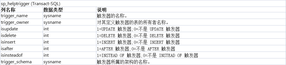 返回对当前数据库的指定表定义的 DML 触发器的类型。sp_helptrigger不能与 DDL 触发器一起使用。