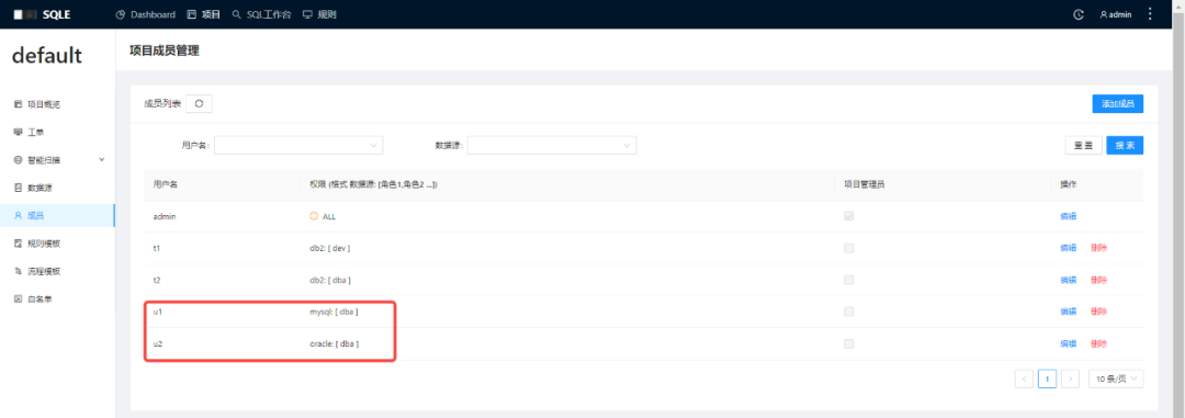 1. 添加成员 u1、u2,为 u1 绑定 MySQL 实例上的 DBA 权限,为 u2 绑定 Oracle 实例上的 DBA 权限。