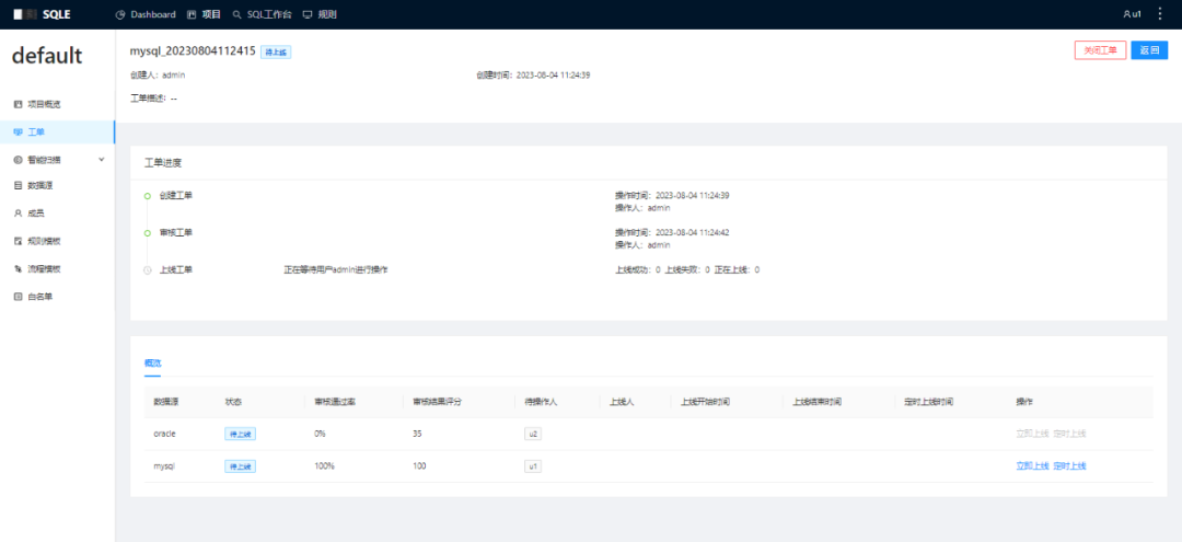 3. 创建一则工单,其中包含对 MySQL 实例及 Oracle 实例的 SQL 操作。审核通过后,查看待操作人分别为该实例上具有上线权限的成员。