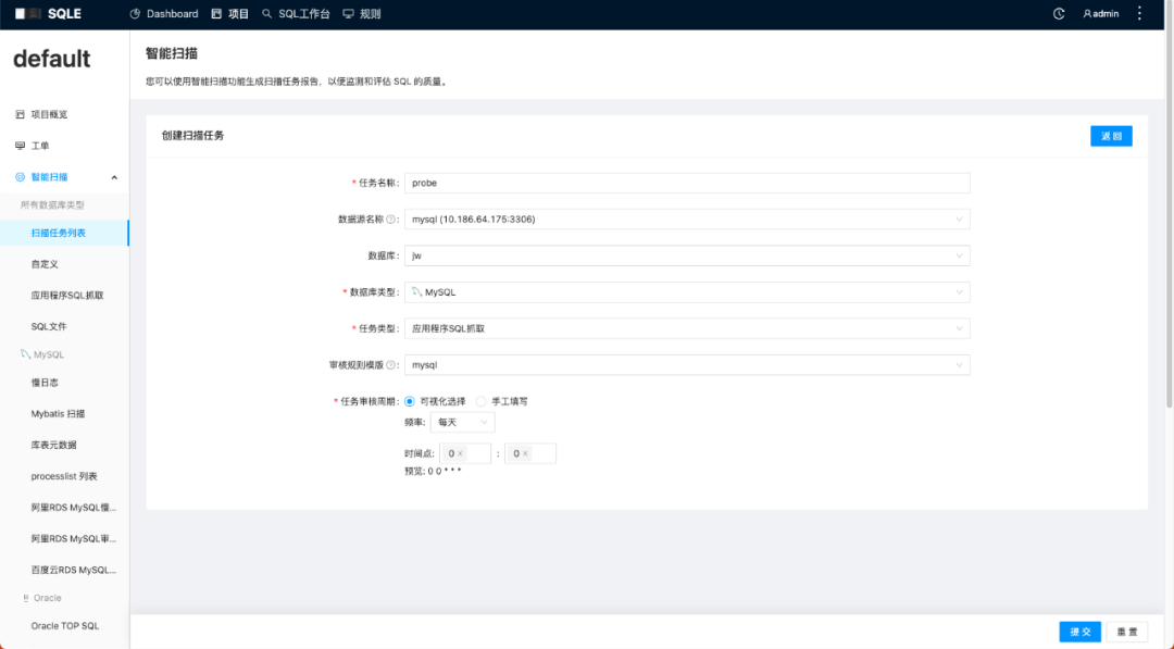 平台新增扫描任务,当前支持对 SQL 文件进行扫描。利用该扫描任务,用户可以在批量执行 SQL 前发现潜在的安全漏洞、提高数据库性能及数据库开发质量。以下是简单的功能试用: