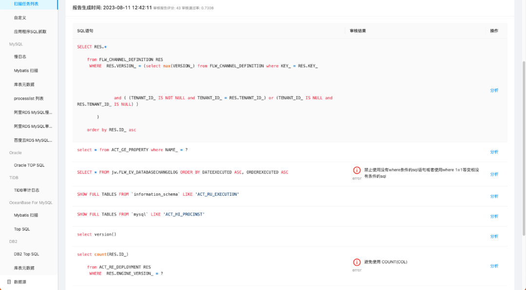 4. 查看审核报告,用户可以通过审核任务的审核报告了解到应用的 SQL 是否符合预设审核规则,以便及时作出调整。