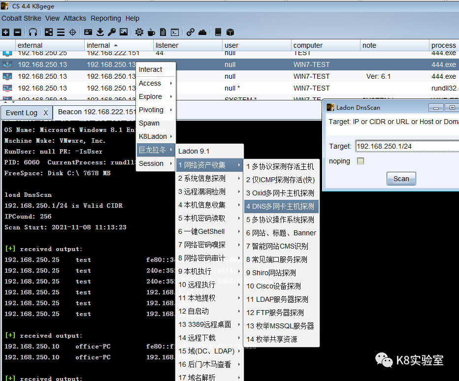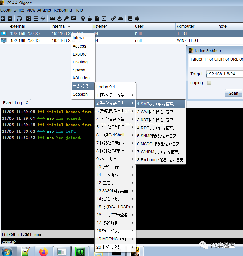 本文内容为Ladon6.2,如今已更新到9.1,可用于探测存活主机的方法或协议更多,如下图为CS4.4加载最新版Ladon插件探测信息模块截图,最新版功能: http://k8gege.org/p/Ladon.html