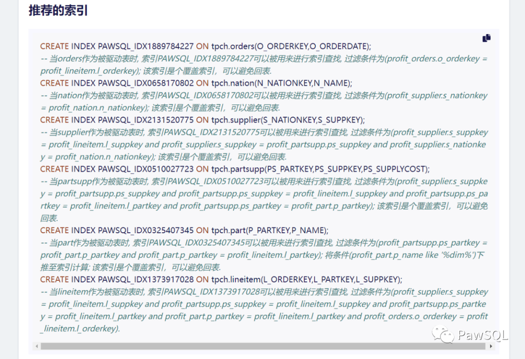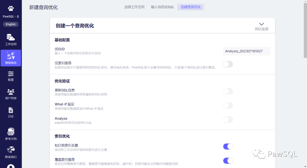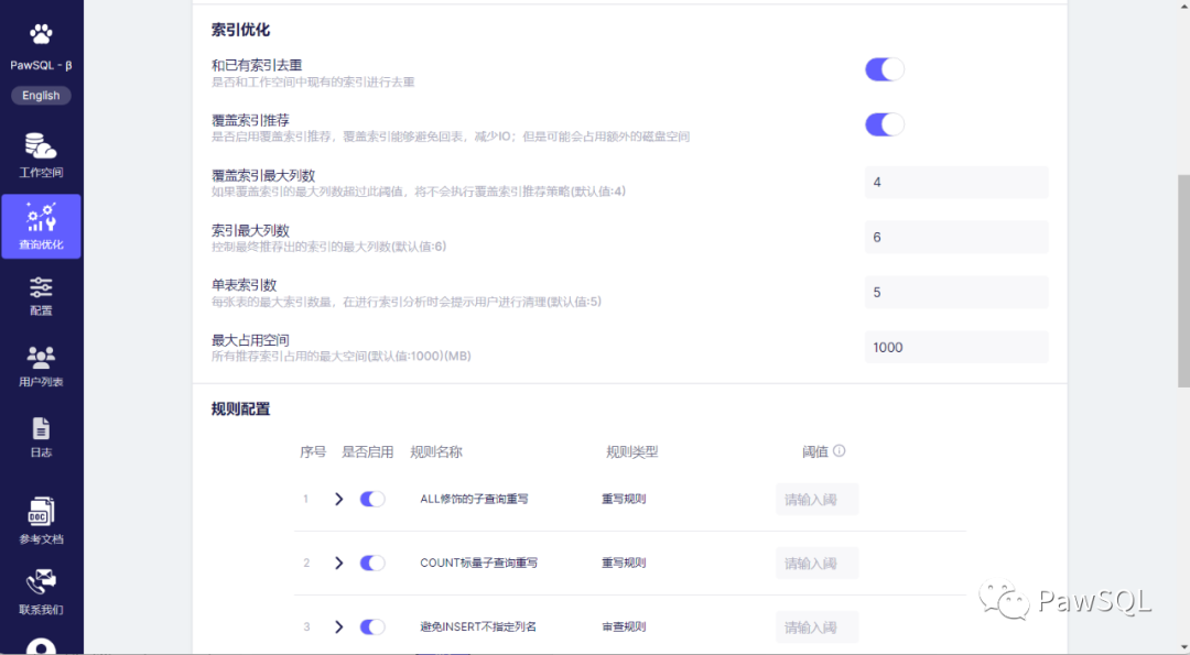 是否仅索引推荐:此选项控制是否启用重写优化,在SQL已经上线的情况下,修改SQL可能无法立即实施,在此情况下,可以禁用此选项;PawSQL将不会重写您的SQL,只是基于原SQL进行索引推荐。