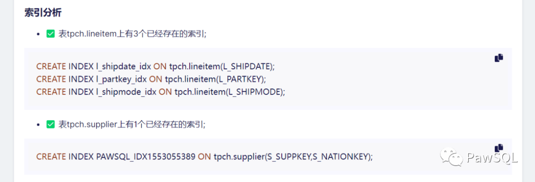 注意:最后两个性能验证的选项应避免在生产库上使用,因为对于没有内置what-if(内置虚拟索引)的数据库(MySQL/Postgres皆是)来说,性能验证是通过创建推荐索引并进行explain分析执行计划,然后删除推荐索引的方式来做的。这个过程在生产库上会消耗一定的资源,且执行时间可能会比较长,可能对生产库上的业务运行产生影响。
