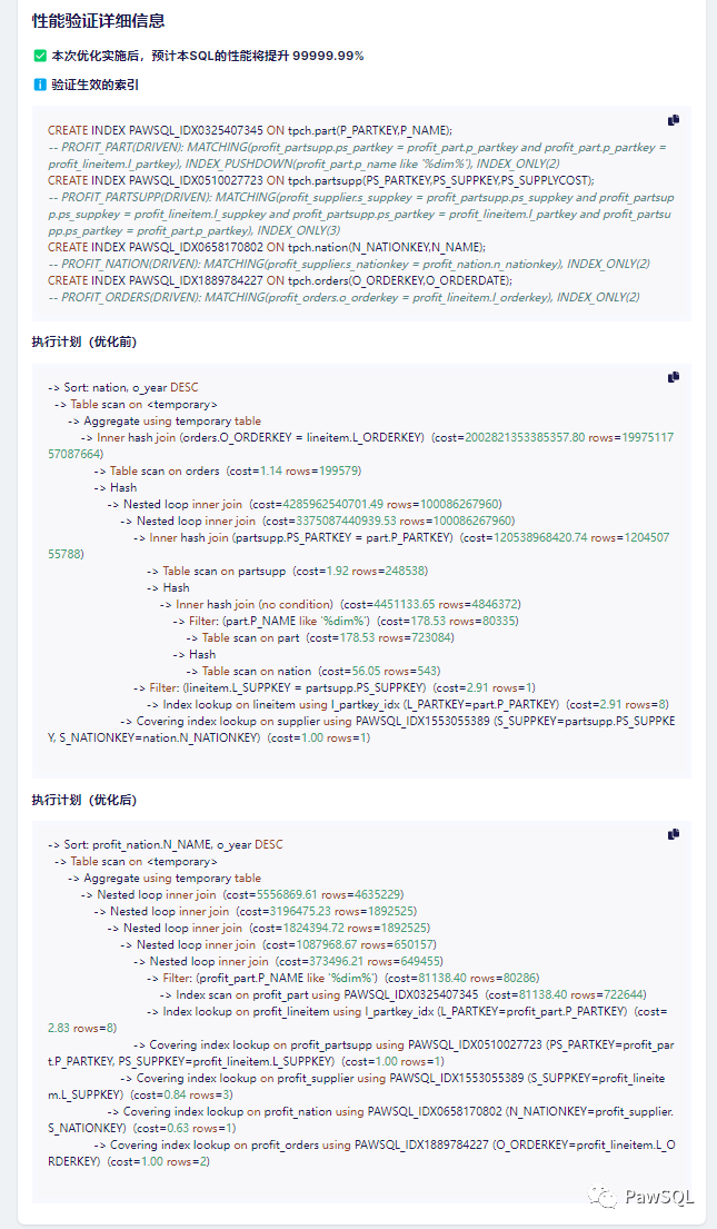 是否启用What-If性能验证,此选项控制是否对推荐的优化建议进行性能验证,如果启用此选项,PawSQL在优化详情中会提供SQL优化前后的执行计划及代价信息,从而确保推荐的优化建议(重写优化及索引推荐)能够真实提升数据库性能。