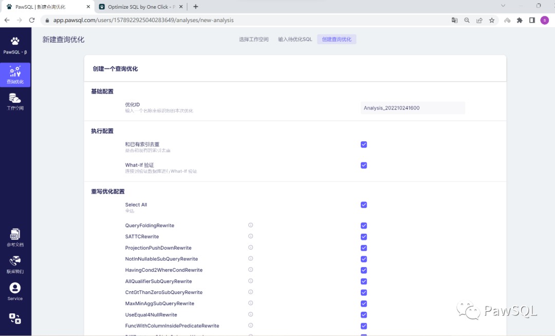 大家可以点击原文链接或是登录网址https://app.pawsql.com尝鲜使用PawSQL Cloud。如需私域部署,或是希望集成PawSQL的优化引擎到自己的数据库监控平台/SQL审核平台,请联系service@pawsql.com或是关注公众号PawSQL。