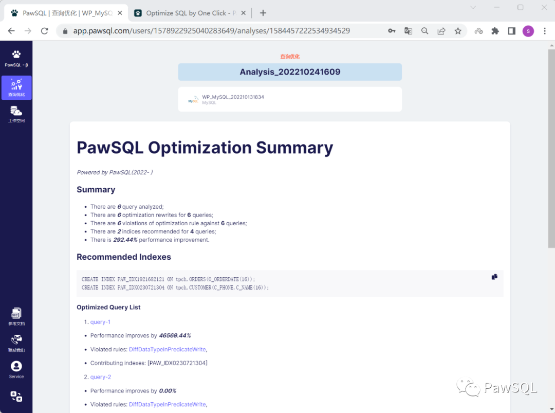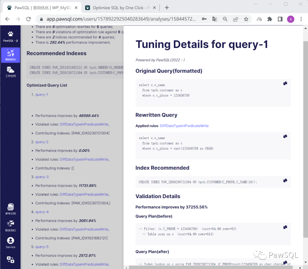 PawSQL Cloud是PawSQL Advisor的Web版本,它们整合了业界关于关系数据库查询优化最佳实践,通过查询重写优化、智能索引推荐,帮助应用开发人员及数据库管理人员一站式解决SQL性能问题。