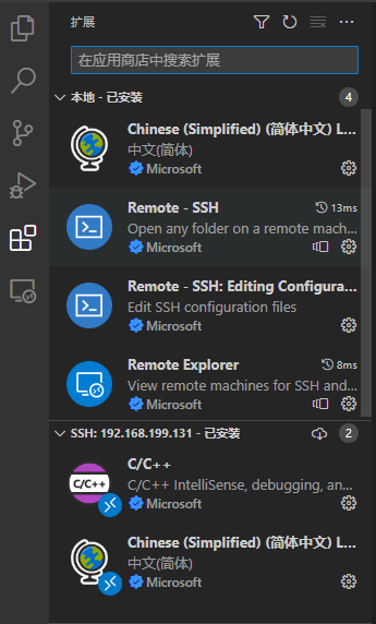 在 VSCode 应用商店搜索并安装以下插件:Chinese、Remote(红框所示部分,下面两个是 Remote-SSH 的依赖,自动带出来的)。