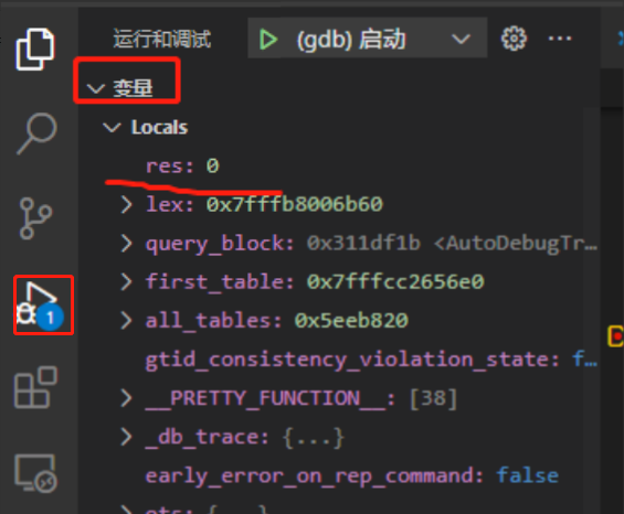 程序在断点处暂停之后,就可以查看一系列运行时信息了,查看断点所在函数的局部变量。