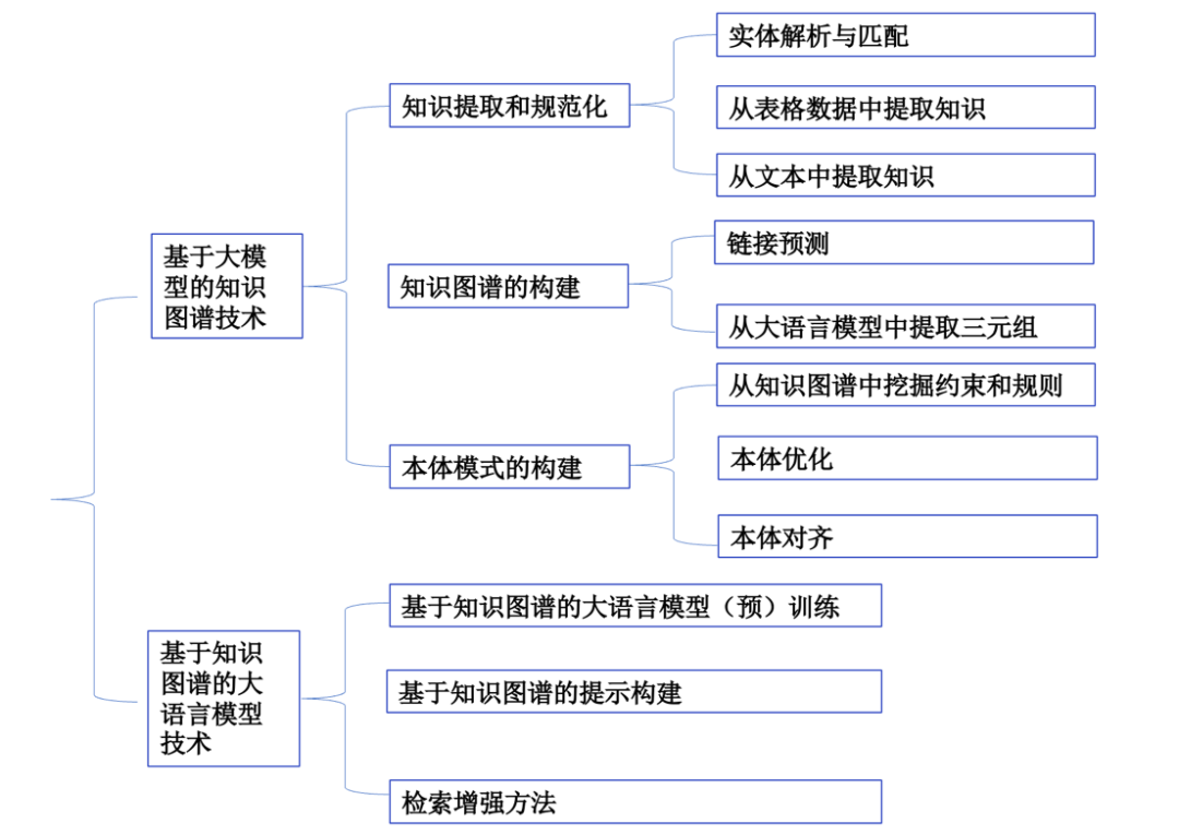 大语言模型作为知识表示的一个发展拐点,将研究人员的目光从显示知识转向到了显示知识和参数化知识混合的方法上。作为显示知识代表的知识图谱,在参数化的语言模型背景下受到了广泛的研究,包括使用知识图谱增强BERT、RoBERTa,以及最近出现的生成式语言模型GPT等。相反,使用大语言模型反向去构造和完善知识图谱也进行了大量的探索,如使用大语言模型来进行知识图谱的补全。