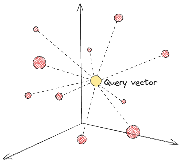 索引可以组织的第二个级别是它们的压缩级别:一个“平坦”或暴力索引是以未经修改的形式存储向量的索引。当接收到查询向量时,它会与数据库中的每个向量进行详尽的比较,如下面简化的三维空间示例所示。实质上,使用这样的索引就像进行kNN搜索,返回的结果是与k个最近邻向量完全匹配的结果。可以想象,返回结果所需的时间会随着数据大小的增加而线性增加,这在应用于包含数十万个向量的数据集时是不实际的。