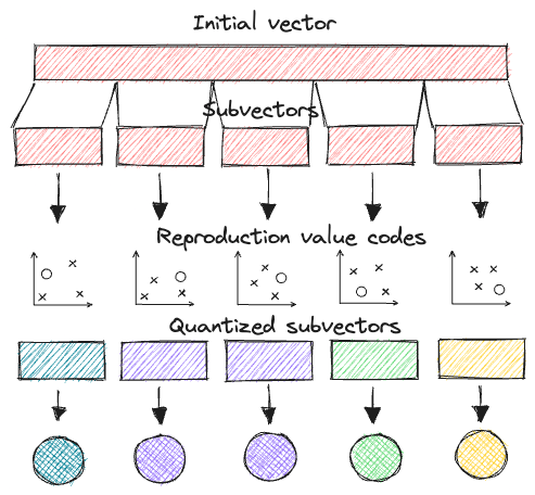 VF-PQ(向量倒排文件索引与产品量化)是在Milvus和LanceDB等数据库中提供的复合索引。索引的IVF部分用于缩小搜索空间,而PQ部分用于加速查询向量与数据库向量之间的距离计算,并通过量化向量来减少内存需求。将两者结合的好处在于,由于PQ组件的存在,速度得到了大幅提升,并且IVF组件有助于提高(通常由于PQ组件而受到损害的)召回率。 PQ组件可以根据下面的图表进行分解。表示数据点的每个向量由固定数量的维度d组成(取决于上游使用的嵌入模型,通常为数百或数千)。由于在大型数据集上存储这么多32位或64位浮点数可能非常昂贵,产品量化通过两个阶段来解决这个问题:第一阶段是粗量化阶段,将向量分成m个子向量,每个子向量的维度为d/m,并为每个子向量分配一个量化值(称为“重构值”),将原始向量映射到该子空间中点的质心。 第二阶段类似于k-means聚类,通过最小化原始向量与量化向量质心之间的距离来学习一组“码本”值。通过将大型高维向量映射为较小的低维子向量,只需存储量化值的码本,从而使内存占用量大大减小。