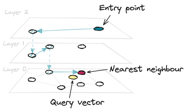 您的数据所在的向量空间也可以被视为一个可导航的小世界(NSW)图,其中节点表示数据点,边表示相似性,即描述两个节点在向量空间中的接近程度的数值。NSW通过构建一个无向图来确保全局连通性,即给定任意入口点,可以到达图中的任何节点。首先形成远距离的边(连接远离的节点,需要多次遍历),然后形成短距离的边(连接附近的节点)。长边提高了搜索效率,而短边提高了搜索准确性。可以通过遍历这个图来找到给定查询向量的最近节点。