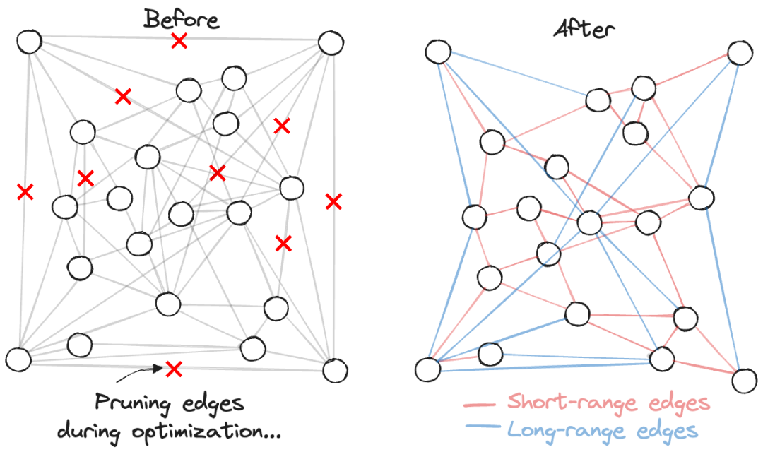 Vamana通过迭代构建一个有向图,首先从一个随机图开始,其中每个节点表示向量空间中的一个数据点。在开始时,图是高度连接的,即几乎所有节点都相互连接。然后,使用一个目标函数对图进行优化,该函数旨在最大化彼此最接近的节点之间的连接性。这是通过修剪大部分随机的短程边缘,并添加连接相距较远的节点的某些长程边缘(以加快图中的遍历)来实现的。