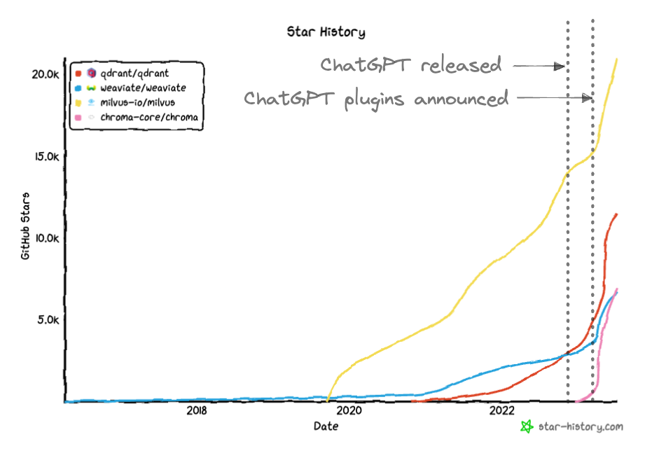 在2022年11月,OpenAI发布了ChatGPT的早期演示(它是GPT 3.5及以上版本的OpenAI接口),随后它迅速成为历史上增长最快的应用程序,在仅仅5天内就获得了一百万用户🤯!事实上,如果你查看一些主要的开源向量数据库存储库在GitHub上的历史记录,可以清楚地看到在2022年11月发布ChatGPT以及随后在2023年3月发布ChatGPT插件后,其中一些存储库的星标计数出现了明显的增长。这些因素以及它们在Hacker News和流行媒体等网站上的相关帖子,是为什么在这个领域出现了如此多的活动的重要原因之一。