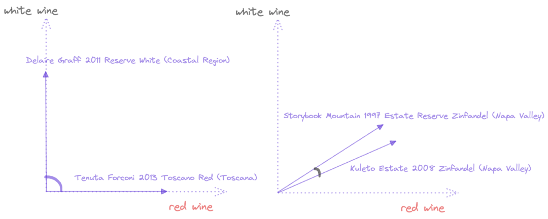 在左边,两种葡萄酒(Reserve White和Toscana Red)在词汇和概念上几乎没有共同之处,因此它们的余弦距离接近零(在向量空间中它们是正交的)。在右边,来自纳帕谷的两种Zinfandel葡萄酒有更多的共同之处,因此它们的余弦相似度更接近1。极限情况下,余弦距离为1;当然,在实际情况中,实际数据存在于更高维的向量空间中(除了葡萄酒的品种之外还有许多其他轴),无法在二维平面上可视化,但余弦相似度的原理仍然适用。