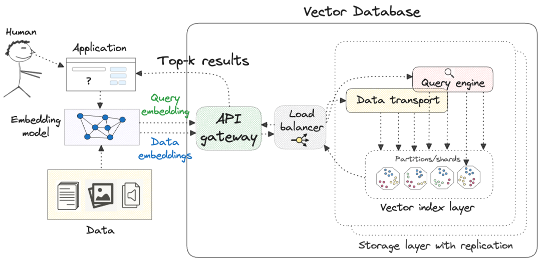 • 向量化的查询通过API网关发送到查询引擎:多个传入的查询被异步处理,并将前k个结果发送回用户。