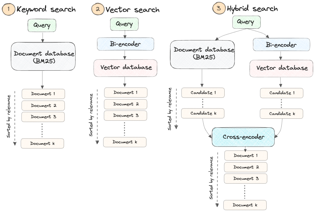 • 混合关键字+向量搜索:通常结合全文关键字搜索和向量搜索的候选结果,并使用交叉编码器模型重新排序它们(见下文)。需要文档数据库和向量数据库。