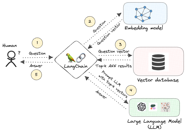 • 构建一个LLM提示(基于开发者预定义的模板),将其转换为嵌入向量,并传递给LLM。使用类似LangChain的框架可以方便地执行此步骤,因为可以动态构建提示,并调用LLM的本地嵌入模块,而无需为每个工作流编写大量自定义代码。