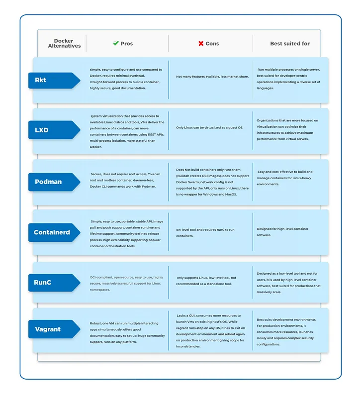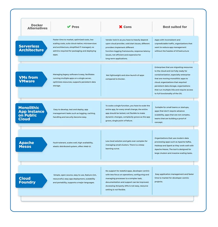 Docker不易使用,有陡峭的学习曲线。管理员必须处理几个问题。例如,应用程序性能监控不是开箱即用的。虽然Docker提供基本的统计信息,但你需要集成第三方工具来实现此目的。 持久化数据存储并不直观,因此你必须将数据移出容器并安全存储。 容器编排需要在配置和管理诸如Docker Swarm、Kubernetes或Apache Mesos等编排工具方面具有相当的专业知识。 与传统堆栈相比,Docker容器需要更多的层来进行安全保护。所有这些因素加起来增加了管理负担。如果没有正确理解这个工具,运行Docker将变得复杂且昂贵。然而,Docker的好处超过了这些小缺点。此外,当你使用Docker的替代方案时,这些挑战也会出现。在长期来看,花费时间和精力来理解Docker将会给你带来巨大的回报。