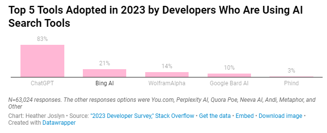 像ChatGPT这样的AI搜索工具也在研究中得到了突出的展示。在回答已经使用过Stack Overflow询问的11种不同AI搜索工具中的一种的受访者中,以下百分比的开发者在过去一年中使用过这些工具: