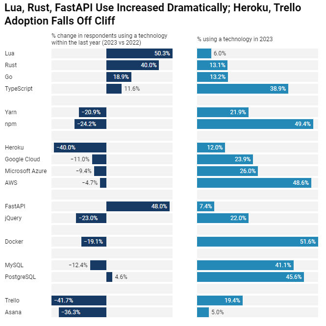 在2023年,Lua和Rust编程语言的采用率激增,Python基础的FastAPI框架的采用率也有所增加,这些都是来自全球超过90,000名开发者的最新调查报告。