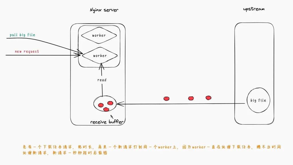 并且已知,卡顿的原因是打开 reuseport 后,新进来的请求可以由内核 hash 派发给一个 Nginx woker ,避免了锁争抢以及惊群。但如果网络条件足够好,压力足够低,Nginx worker 一直来不及读完 receive buffer 中的内容时,就无法切换并处理其他的 request,于是在新请求的客户端会观测不间断的卡顿,而压力大的后端由于网络传输慢,经常卡顿,Nginx worker 反而有时间能处理别的请求。在调小 receive buffer 人为制造卡顿后该问题得以解决。