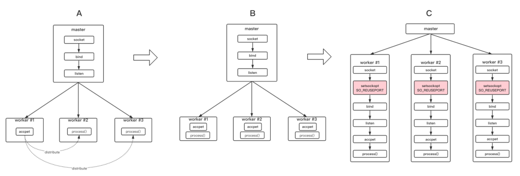 而开启reuseport后(C 图),有多个 listener 共同 bind/listen 相同的 IP/PORT,也就是说每个进程/线程有一个独立的 listener,相当于每个进程/线程独享一个 listener 的全连接队列,新的连接请求由内核hash分配,不需要多个进程/线程竞争某个公共资源,能充分利用多核,减少竞争的资源消耗,效率自然提高了。