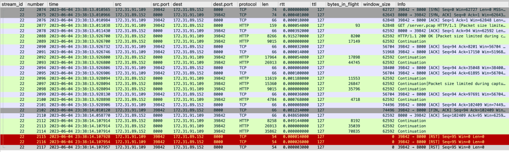 172.31.91.109 [05/Jun/2023:06:13:23 +0000] "GET server.pcap HTTP/1.1" status=200 body_bytes_sent=3602590 rt=0.044 uct="0.000" uht="0.001" urt="0.044"