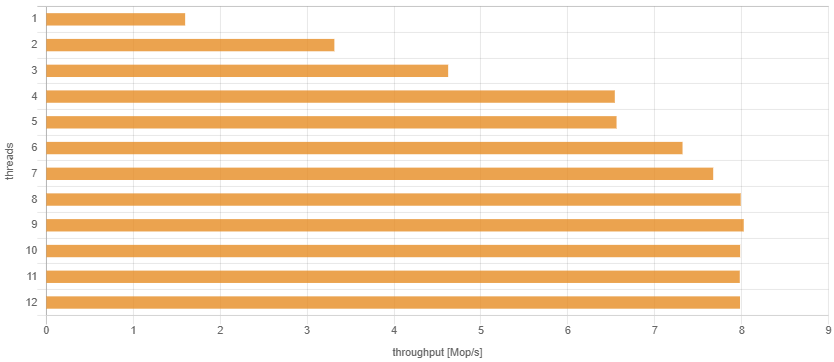 因为有4个核心,吞吐量可以线性增加,直到4个线程。然后,由于超线程技术可以从每个核心中挤出更多性能,吞吐量在8个线程时稍微增加。显然,在超过8个线程后就没有性能改进了,因为此时所有的CPU资源都已饱和。