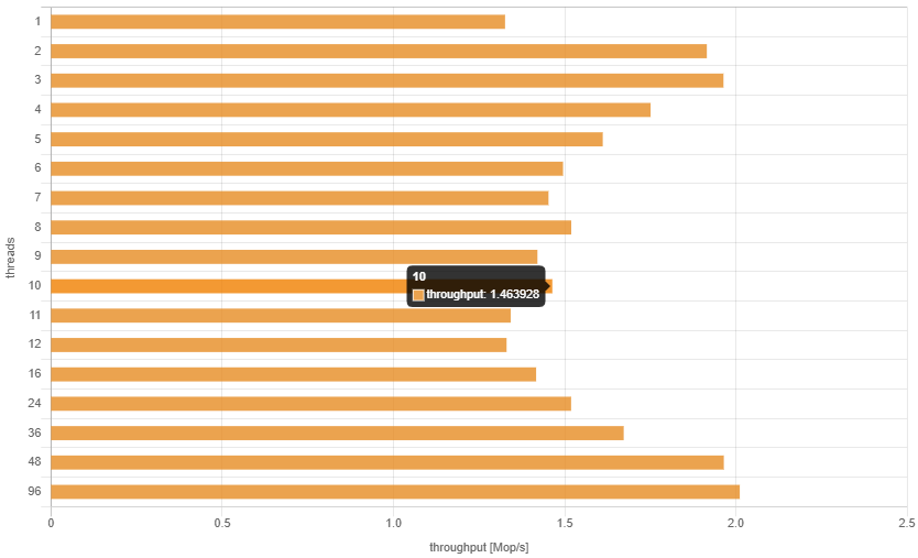 然而,无论代码看起来多么无害,我还是喜欢对我的假设进行双重检查。我使用不同数量的线程运行了该代码,并且尽管它现在比以前快,但它仍然没有扩展性 - 它的吞吐量达到了每秒约400万次调用的上限!