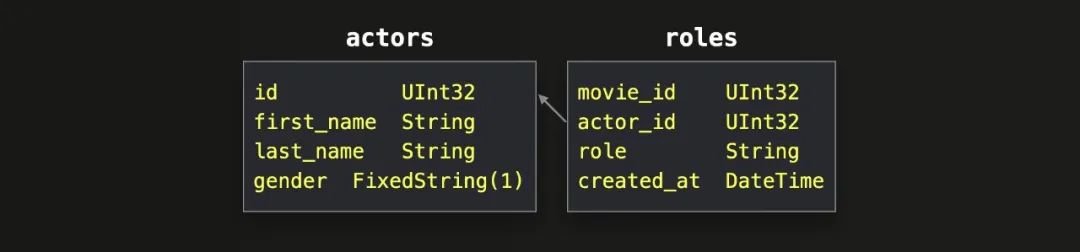 SELECTtable,formatReadableQuantity(sum(rows)) AS rows,formatReadableSize(sum(data_uncompressed_bytes)) AS data_uncompressedFROM system.partsWHERE (database = 'imdb_large') AND activeGROUP BY tableORDER BY table ASC;┌─table──┬─rows───────────┬─data_uncompressed─┐│ actors │ 1.00 million │ 21.81 MiB ││ roles │ 100.00 million │ 2.63 GiB │└────────┴────────────────┴───────────────────┘