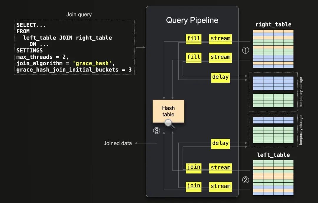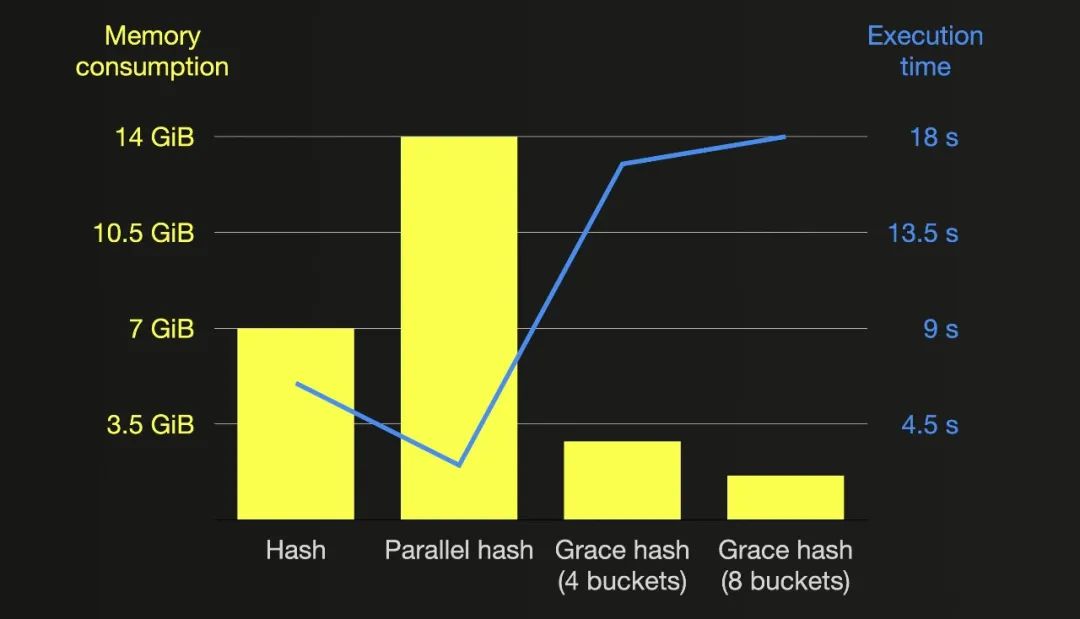 SELECT *FROM actors AS aJOIN roles AS r ON a.id = r.actor_idFORMAT `Null`SETTINGS join_algorithm = 'grace_hash', grace_hash_join_initial_buckets = 8;0 rows in set. Elapsed: 16.366 sec. Processed 101.00 million rows, 3.67 GB (6.17 million rows/s., 224.00 MB/s.)Let’s check runtime statistics for the last two query runs:SELECTquery,formatReadableTimeDelta(query_duration_ms 1000) AS query_duration,formatReadableSize(memory_usage) AS memory_usage,formatReadableQuantity(read_rows) AS read_rows,formatReadableSize(read_bytes) AS read_dataFROM clusterAllReplicas(default, system.query_log)WHERE (type = 'QueryFinish') AND hasAll(tables, ['imdb_large.actors', 'imdb_large.roles'])ORDER BY initial_query_start_time DESCLIMIT 2FORMAT Vertical;Row 1:──────query: SELECT *FROM actors AS aJOIN roles AS r ON a.id = r.actor_idFORMAT `Null`SETTINGS join_algorithm = 'grace_hash', grace_hash_join_initial_buckets = 8query_duration: 16 secondsmemory_usage: 2.10 GiBread_rows: 101.00 millionread_data: 3.41 GiBRow 2:──────query: SELECT *FROM actors AS aJOIN roles AS r ON a.id = r.actor_idFORMAT `Null`SETTINGS join_algorithm = 'grace_hash', grace_hash_join_initial_buckets = 3query_duration: 13 secondsmemory_usage: 3.72 GiBread_rows: 101.00 millionread_data: 3.41 GiB
