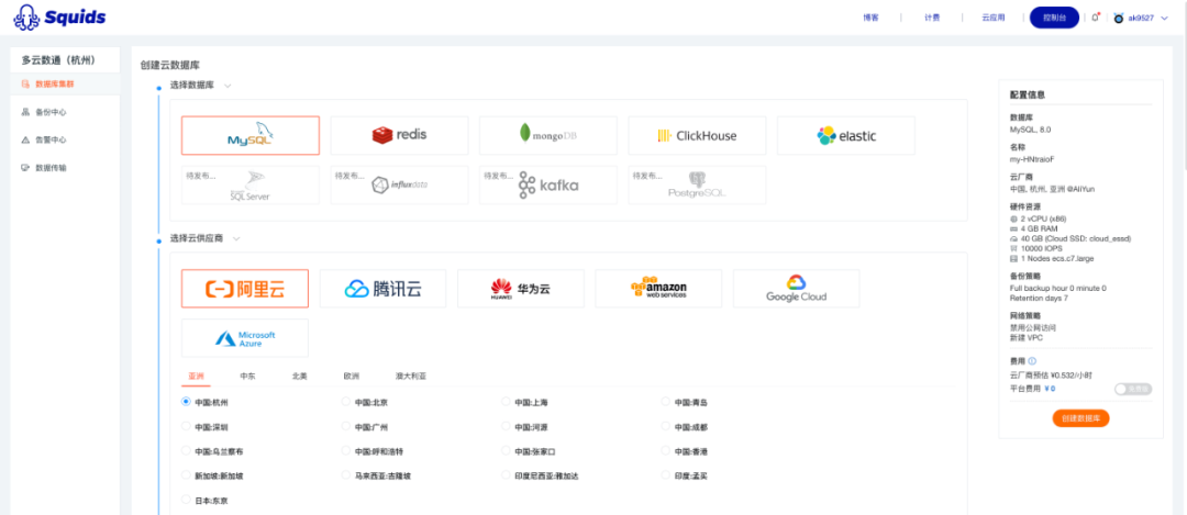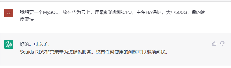 如果从交互应用层面看,ChatGPT应该会给我们很多惊喜。从Graphical UI变Chat UI,用自然语言直接链接下层的应用服务,我们做好这些转换节点的设计和编码就可以了。比如小编君参与的squids.cn项目,基于公有云计算资源构建数据库服务,现在是个冷冰冰的界面,你需要一层层地选下去,用户体验呆板,前端交互也绞尽脑汁。