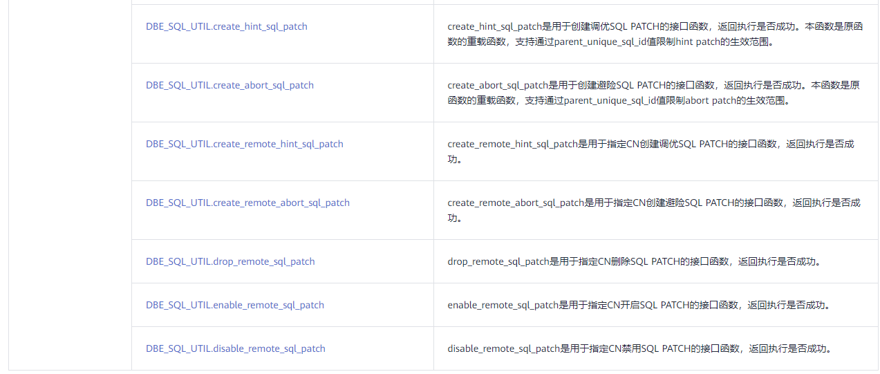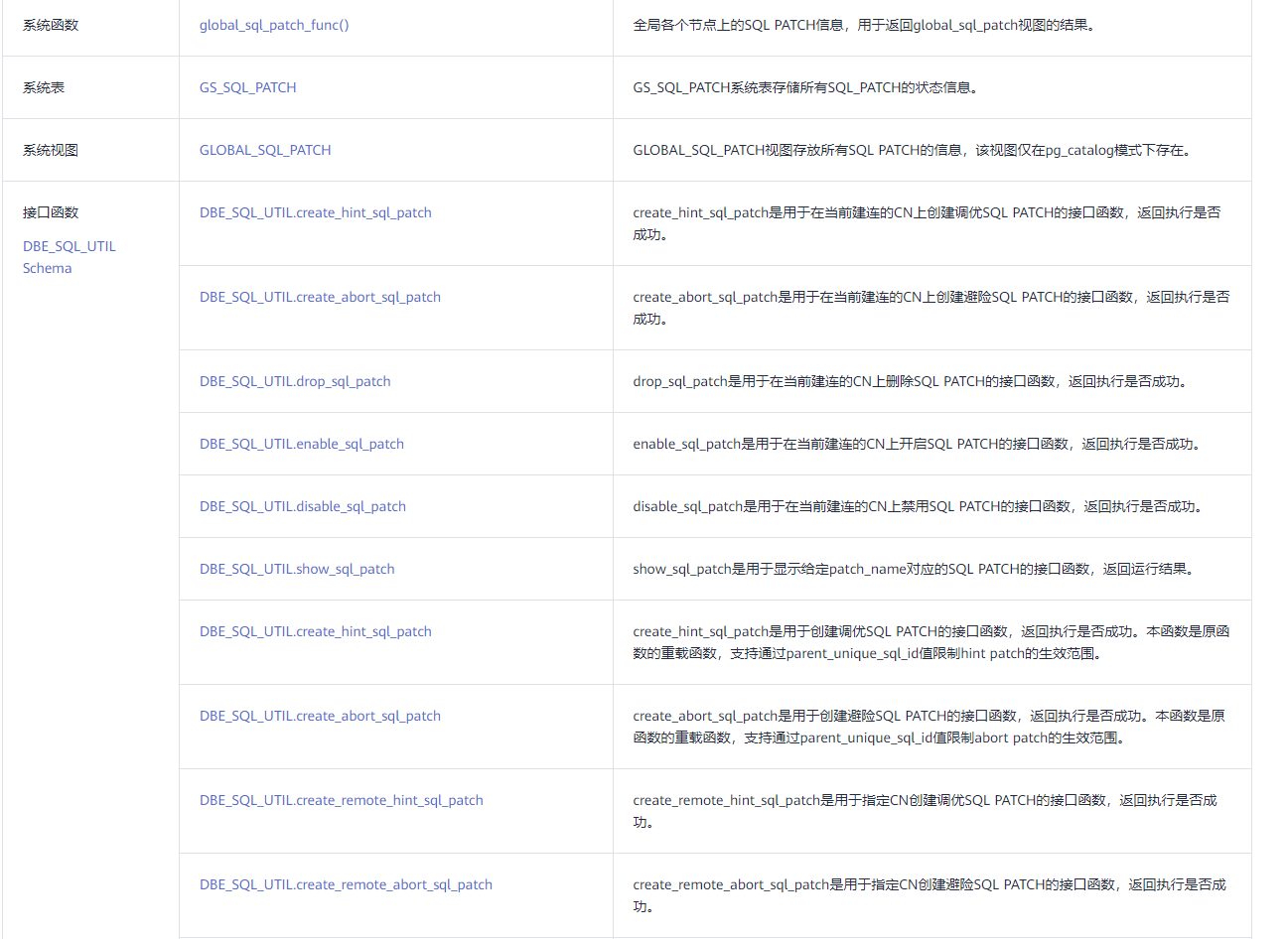 SQL PATCH相关系统函数、系统表、系统视图和接口函数见下表。