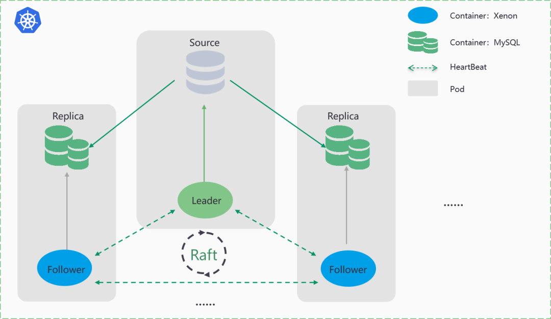 每一个 Pod 里面的 Xenon 管理当前 Pod 中的 MySQL,主要获取并保存当前状态,获取当前执行的复制状态信息。