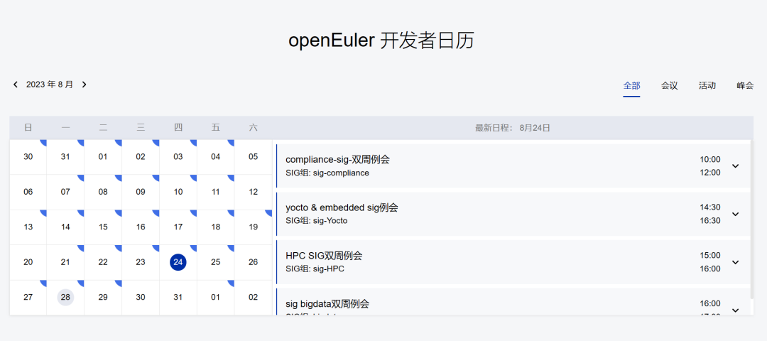 首先,我们需要明确想参与的SIG组,并订阅该SIG组的邮件列表(查找SIG:https://www.openeuler.org/zh/sig/sig-list/),以便及时获悉SIG动态消息。如果您在邮件中查看不到会议消息,可以在 openEuler官网的开发者日历(https://www.openeuler.org/zh/)中查找每一场SIG会议。