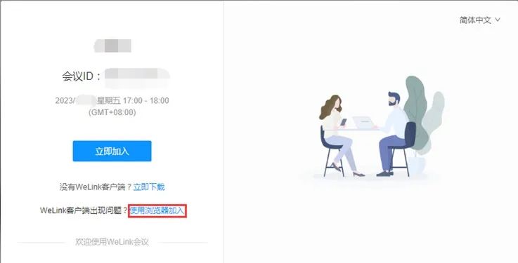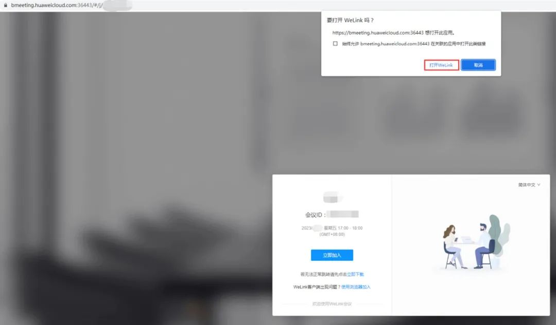 4.通过上文的指引获取WeLink会议链接后,在浏览器中打开。点击唤醒弹框中的打开WeLink,即可通过客户端接入会议。