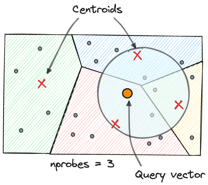 然后,IVF被应用于PQ向量空间 - 对于空间中的每个点,都有一个相应的区域,称为Voronoi单元,其中包含所有距离源点(种子点)比任何其他点更近的空间中的点。这些种子点用于创建一个倒排索引,将每个质心与空间中的向量列表相关联。